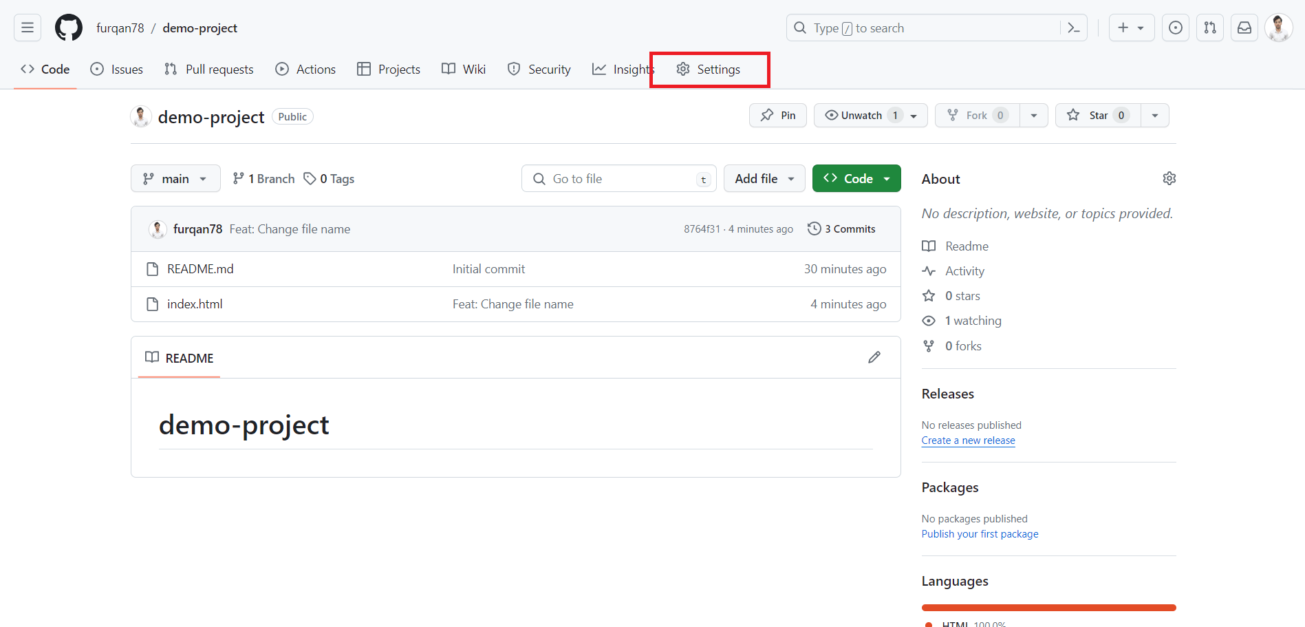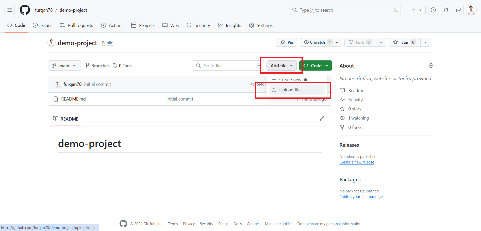 After clicking on 'demo-project,' you'll get the branches of the repository. Continue by clicking on the 'Add file' button, then select 'Upload files.' Upload all the web pages of your website, confirming that the index.html file should be placed in the root folder.